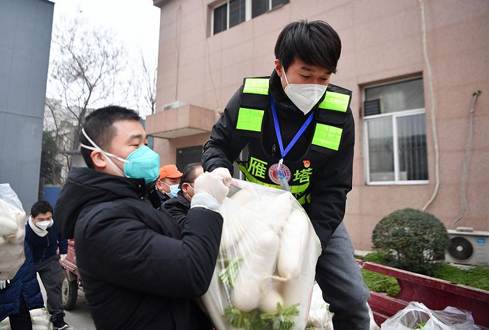 ↑1月6日,西安市雁塔區(qū)退役軍人志愿突擊隊隊員侯磊(右)協(xié)助社區(qū)工作人員搬運物資。