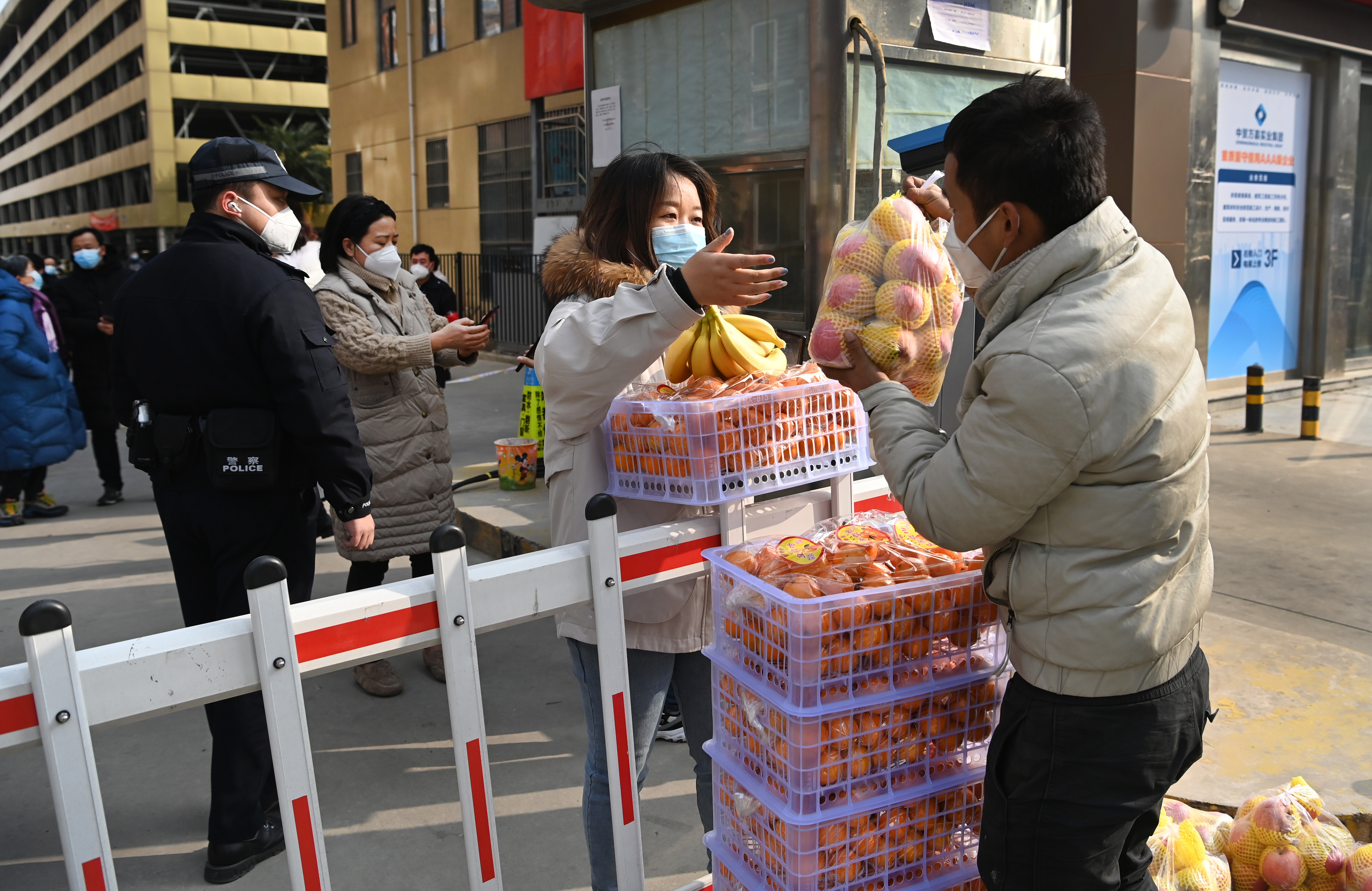 1月10日,雁塔區(qū)科技路一小區(qū)的工作人員在為居民配送愛心人士捐贈的蔬菜。新華社記者 陶明 攝