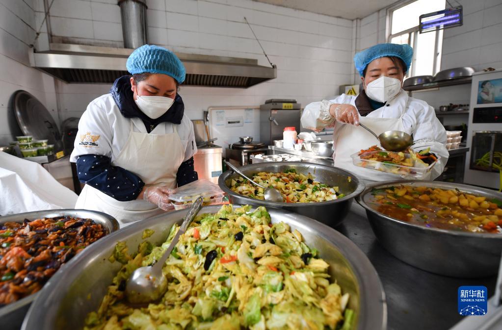 1月12日,三家村工作人員將做好的午餐裝盒準(zhǔn)備派送。新華社記者 張博文 攝