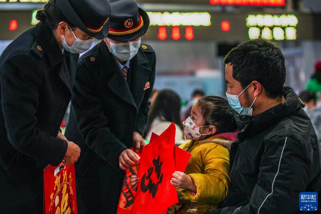 1月17日,貴陽(yáng)客運(yùn)段工作人員在貴陽(yáng)火車站為候車旅客送上福字與春聯(lián)。新華社記者 陶亮 攝