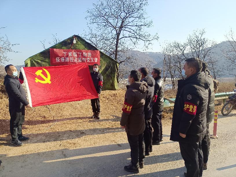 咸陽(yáng)市長(zhǎng)武縣丁家鎮(zhèn)丁陶路疫情防控臨時(shí)黨支部黨員向黨旗宣誓。 趙輝 攝