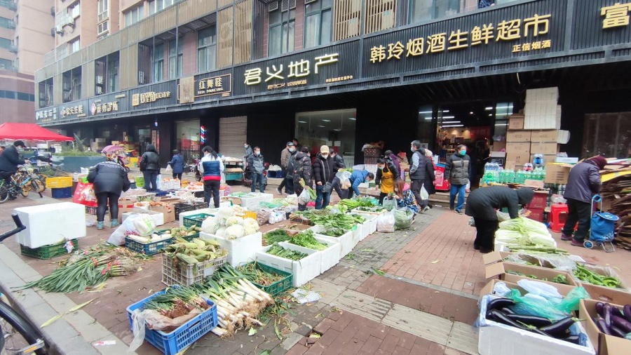 走出超市,漫步街邊,沿街陸續(xù)開(kāi)業(yè)的小商鋪,同樣展現(xiàn)著這個(gè)城市久違的活力。在楓葉廣場(chǎng)2期小區(qū)西南門(mén),正在營(yíng)業(yè)的蔬菜店、水果店生意很是不錯(cuò),新鮮的茄子、青筍、白菜用紙箱裝著,被整整齊齊地?cái)[在沿街人行道上,不少市民正在選購(gòu)心儀的菜品。