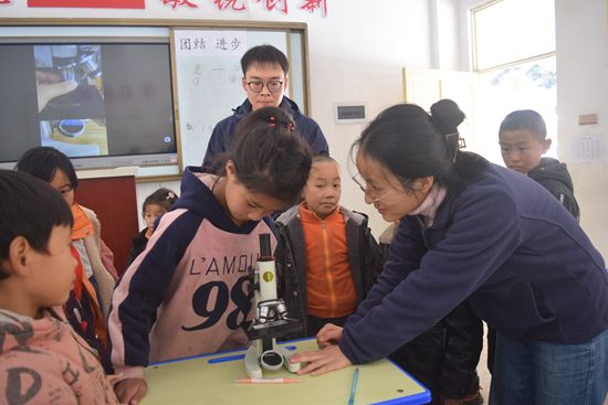 華中農(nóng)業(yè)大學研支團志愿者教學生們使用顯微鏡。