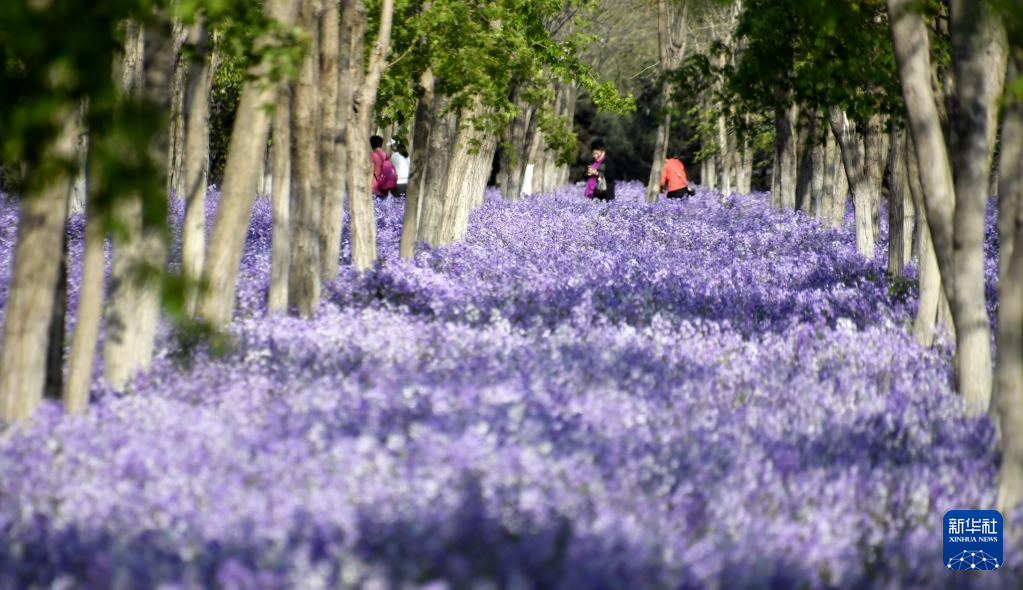 4月19日,游人在北臧村鎮(zhèn)永定河畔的綠色港灣林間賞花。