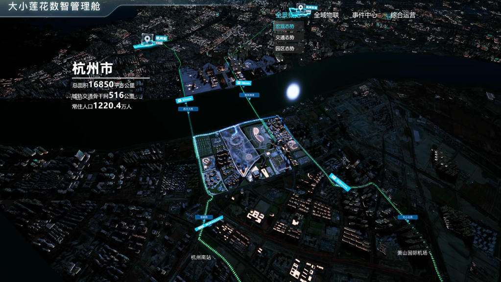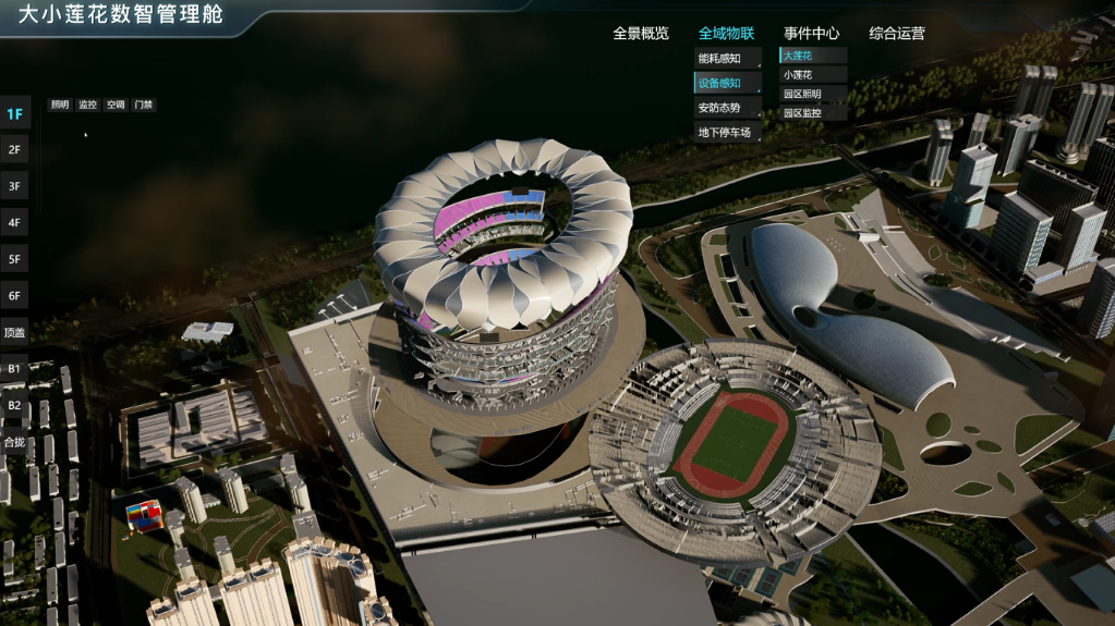 因外形酷似兩朵盛開的蓮花,杭州奧體中心主體育場和網(wǎng)球中心決賽館常被杭州市民昵稱為“大小蓮花”。走進(jìn)奧體中心運(yùn)營大廳,映入眼簾的是一塊超級大屏,名為“大小蓮花”數(shù)智管理艙,屏幕上呈現(xiàn)的是整個奧體園區(qū)的虛擬模型。