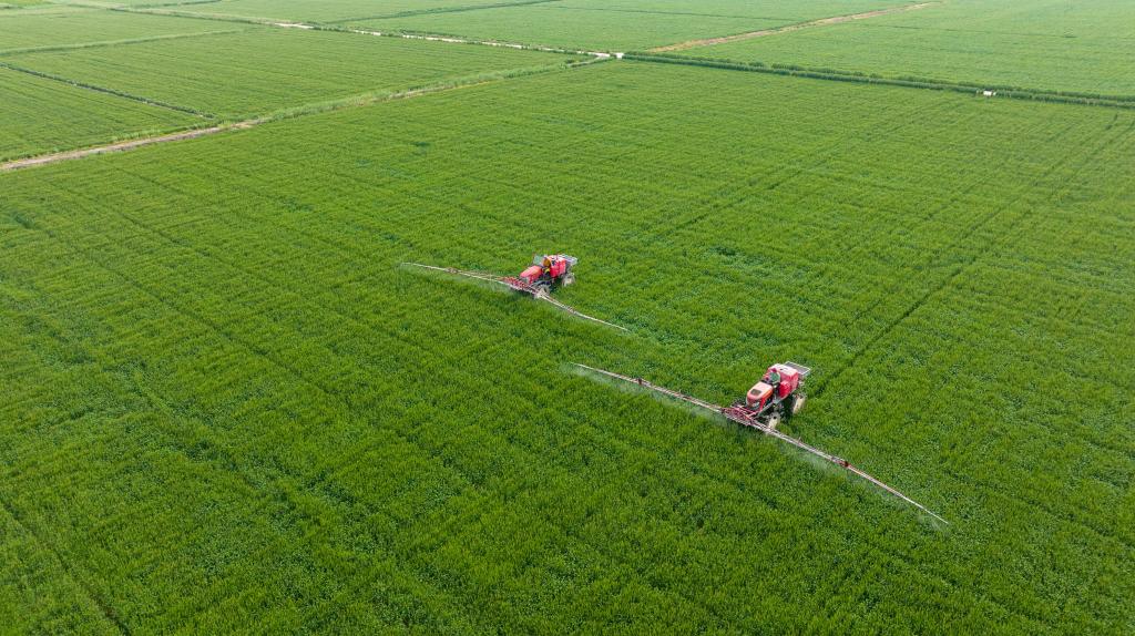 2022年4月20日,江蘇省海安市孫莊街道夏岔村一種植基地,村民駕駛植保機(jī)械在小麥田間作業(yè)(無(wú)人機(jī)照片)。新華社發(fā)(翟慧勇攝)