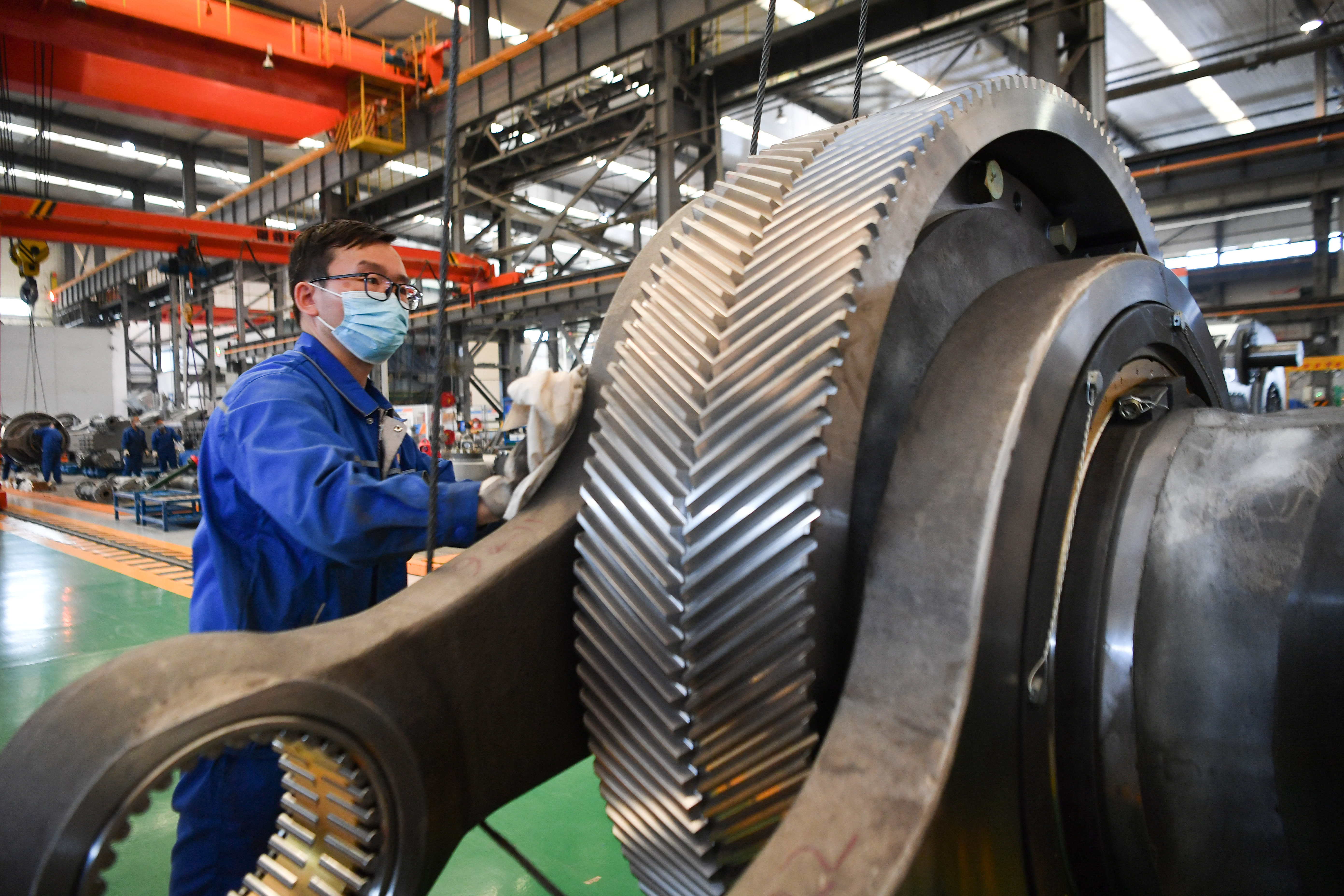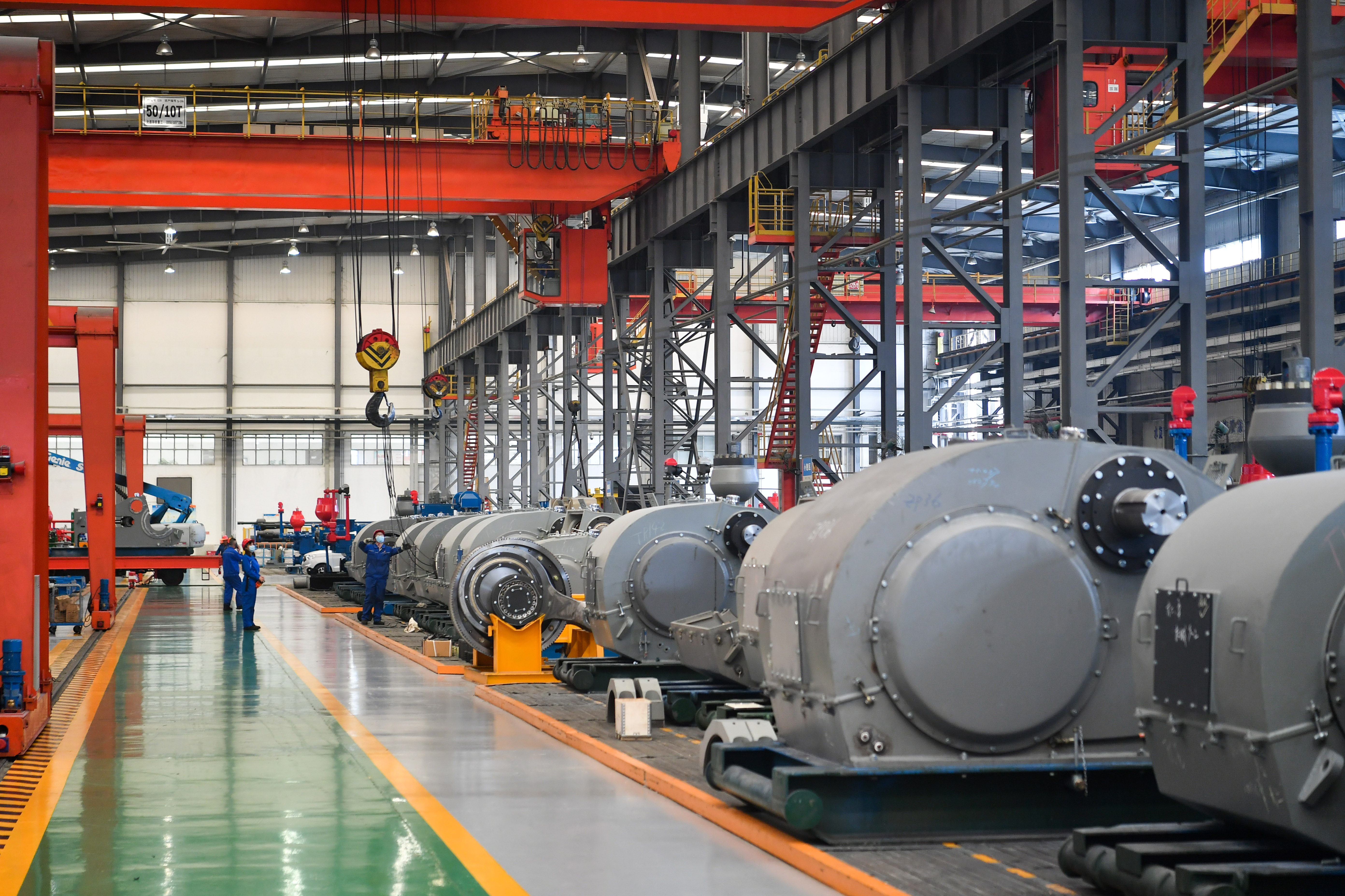 工人在寶雞石油機(jī)械有限責(zé)任公司運(yùn)輸生產(chǎn)設(shè)備。新華社記者 張博文 攝