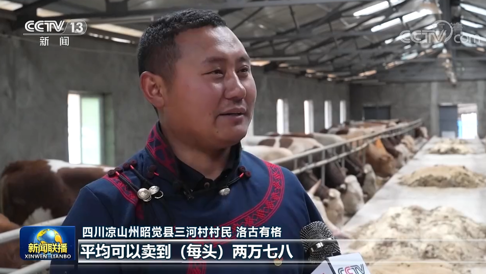 四川涼山州昭覺(jué)縣三河村村民 洛古有格:當(dāng)時(shí)總書記來(lái)的時(shí)候,我們這個(gè)養(yǎng)牛只有十幾頭。通過(guò)發(fā)展,我們?nèi)哟逵辛?000多頭這個(gè)西門塔爾牛?,F(xiàn)在我們這個(gè)牛,平均可以賣到(每頭)兩萬(wàn)七八,大的可以賣到三萬(wàn)多元,效益特別好。