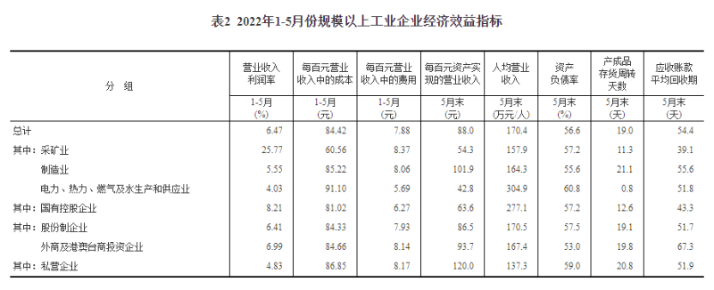 表1 2022年1-5月份規(guī)模以上工業(yè)企業(yè)主要財務指標
