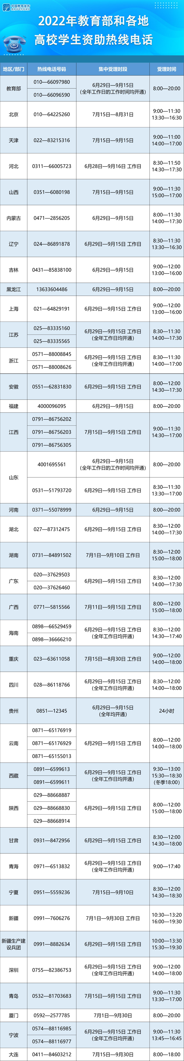 教育部要求各省(區(qū)、市)及所屬高校、中央高校學(xué)生資助管理部門(mén)均開(kāi)通熱線電話,并結(jié)合實(shí)際情況自行確定集中受理時(shí)段和具體受理時(shí)間。