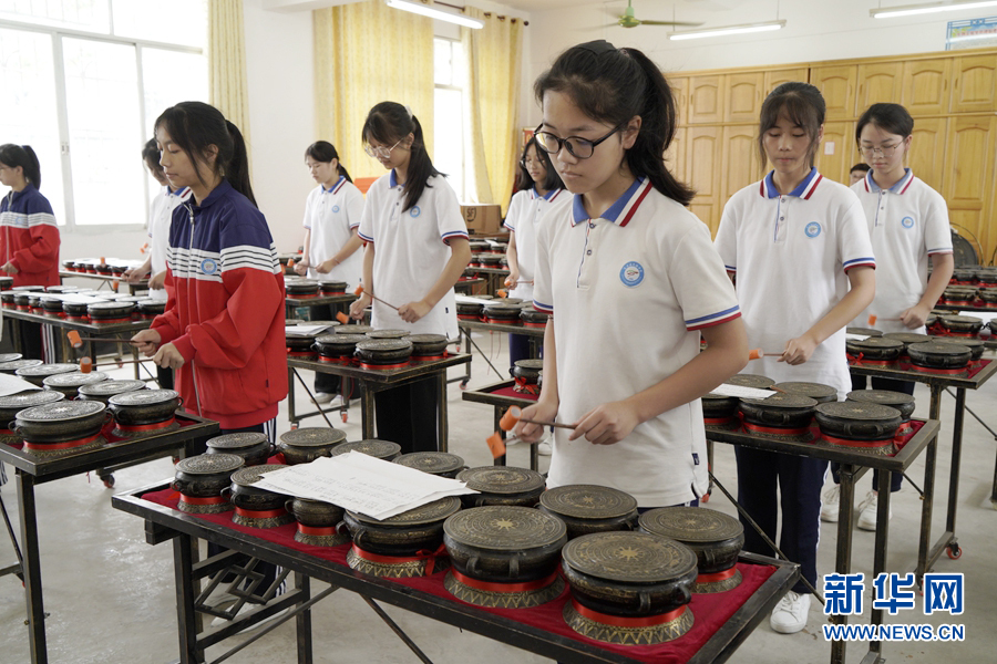 東蘭縣民族中學學生在演奏音樂銅鼓。新華網 谷雨 攝