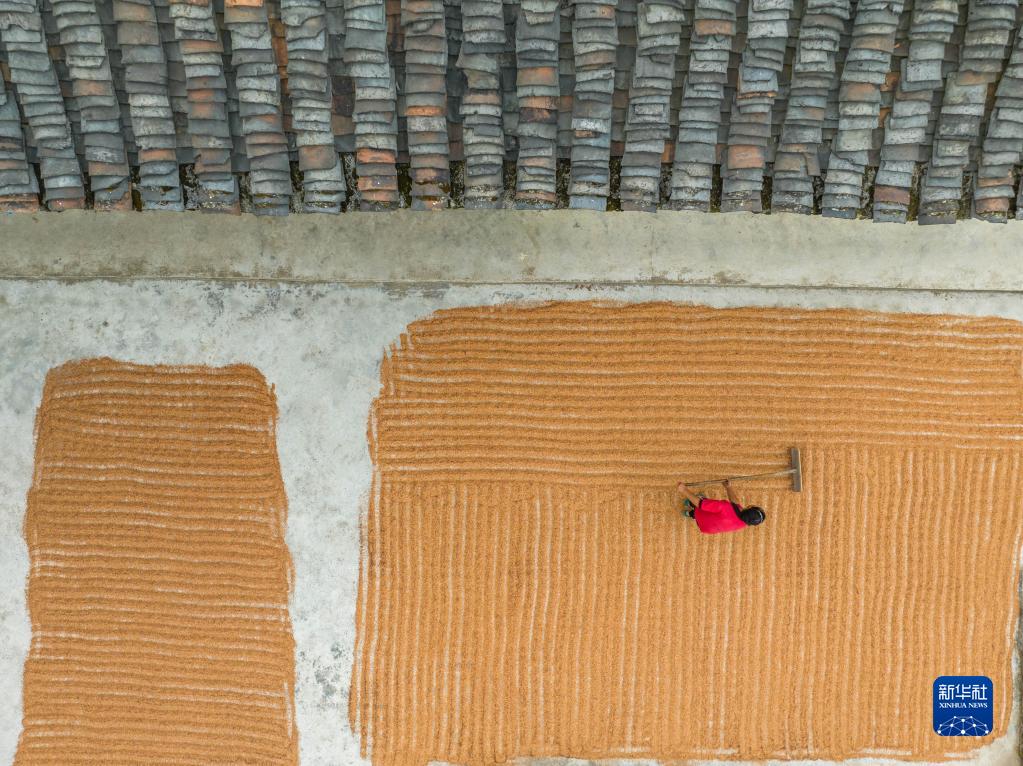 9月1日,貴州省黔西市中建鄉(xiāng)中廣村村民在晾曬糧食(無人機(jī)照片)。新華社發(fā)(羅大富 攝)