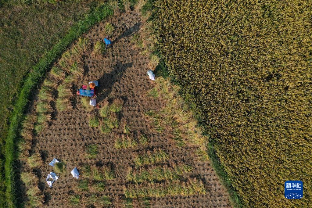 9月1日,村民在貴州省黔東南苗族侗族自治州丹寨縣興仁鎮(zhèn)燒茶村稻田里收割水稻(無人機(jī)照片)。新華社發(fā)(黃曉海 攝)