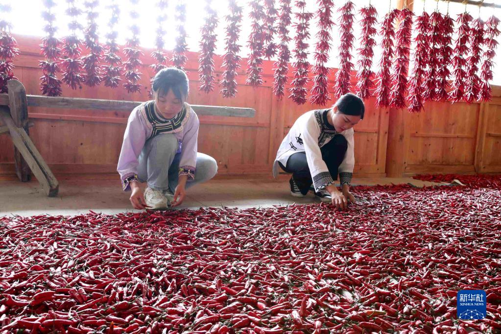 9月1日,在貴州省榕江縣平陽鄉(xiāng)硐里村,村民在晾曬朝天椒。新華社發(fā)(李長華 攝)