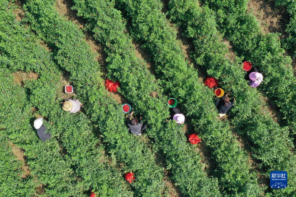9月1日,河南省寶豐縣石橋鎮(zhèn)竹園村農(nóng)民在田間收獲草莓椒(無人機(jī)照片)。新華社發(fā)(何五昌攝)