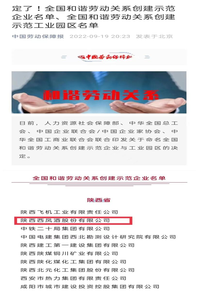 西部決策網(wǎng)訊(記者艾米杰 韓宗憲 通訊員 許凡 張?zhí)炝ⅲ闃淞⑹痉兜湫?、弘揚(yáng)人文關(guān)懷、傳遞和諧溫暖,進(jìn)一步推動(dòng)廣大企業(yè)深入開展和諧勞動(dòng)關(guān)系創(chuàng)建活動(dòng),促進(jìn)構(gòu)建中國特色和諧勞動(dòng)關(guān)系。近日,人力資源和社會(huì)保障部、中華全國總工會(huì)、中國企業(yè)聯(lián)合會(huì)/中國企業(yè)家協(xié)會(huì)、中華全國工商業(yè)聯(lián)合會(huì)聯(lián)合印發(fā)《關(guān)于命名全國和諧勞動(dòng)關(guān)系創(chuàng)建示范企業(yè)與工業(yè)園區(qū)的決定》,陜西西鳳酒股份有限公司榜上有名,榮獲“全國和諧勞動(dòng)關(guān)系創(chuàng)建示范企業(yè)”稱號(hào)。