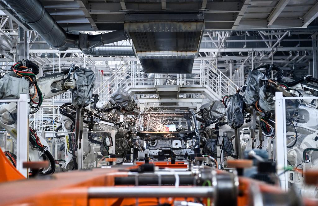 10月17日,在吉林長春中國第一汽車集團有限公司紅旗繁榮工廠焊裝車間內(nèi),焊裝機器人在生產(chǎn)線上焊接車身。新華社記者 顏麟蘊 攝