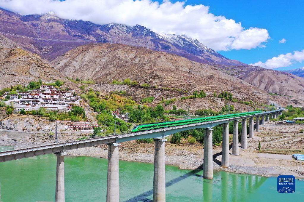 復(fù)興號(hào)列車行駛在西藏朗縣境內(nèi)(2022年4月14日攝)。新華社記者 覺(jué)果 攝
