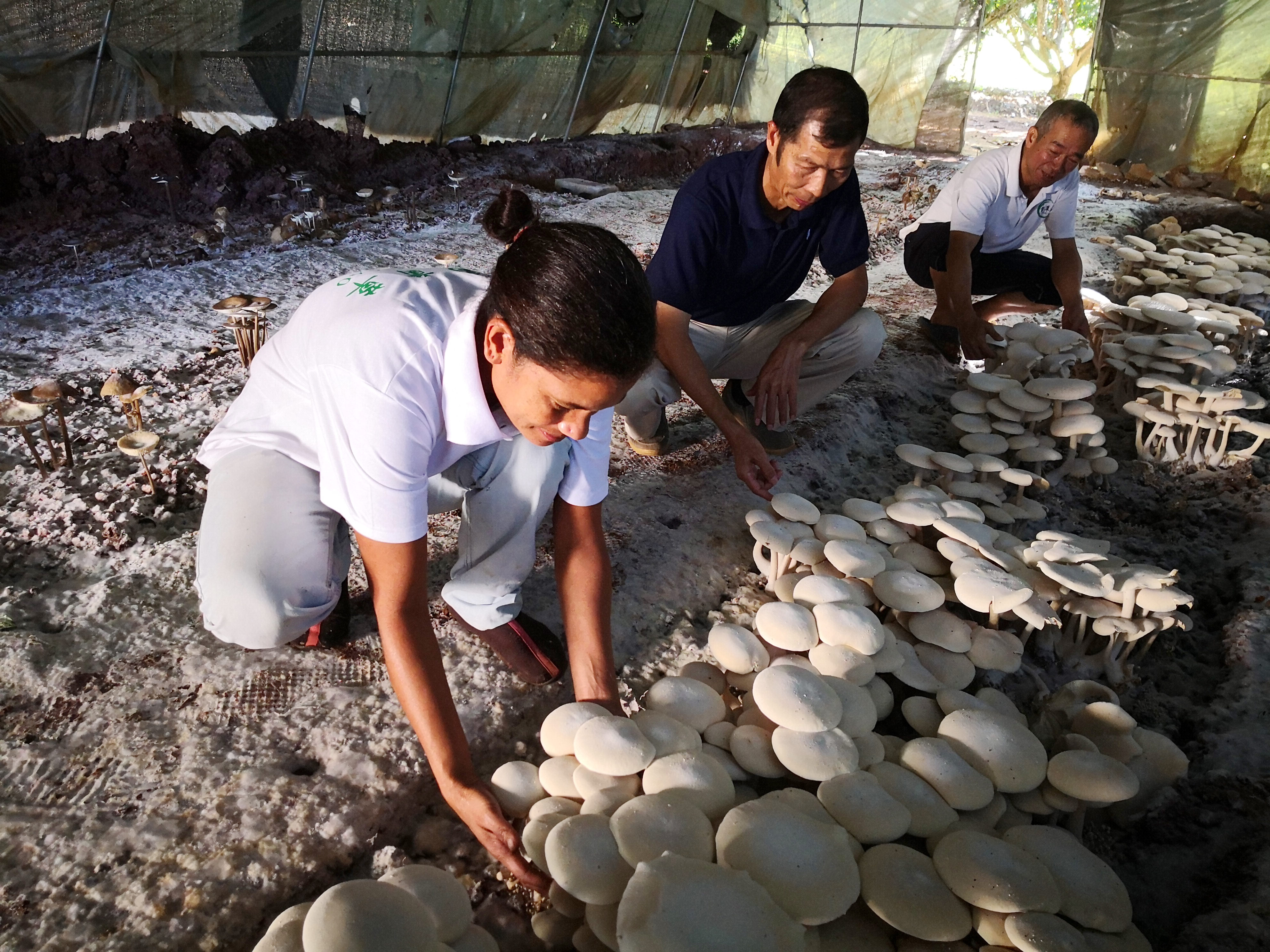 在斐濟(jì)楠迪,中國(guó)專家和當(dāng)?shù)毓蛦T檢查菌菇生長(zhǎng)情況(2018年6月12日攝)。新華社記者 張永興 攝