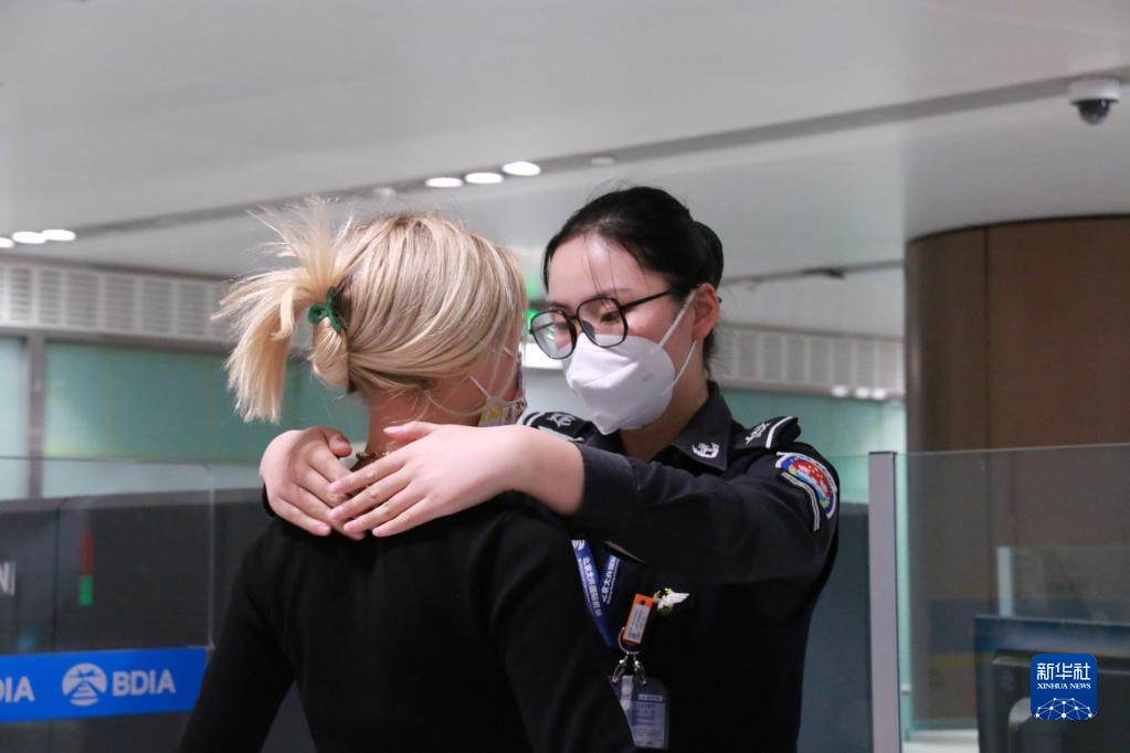 1月17日,在北京大興機(jī)場,安檢員為乘坐CZ309次北京飛往香港航班的旅客安檢。新華社發(fā)(廖玉琳 攝)