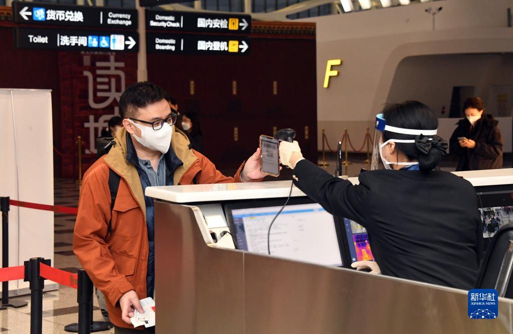 1月17日,在北京大興機(jī)場,海關(guān)關(guān)員準(zhǔn)備核驗(yàn)乘坐CZ309次北京飛往香港航班旅客的海關(guān)健康申報(bào)二維碼。新華社記者 任超 攝