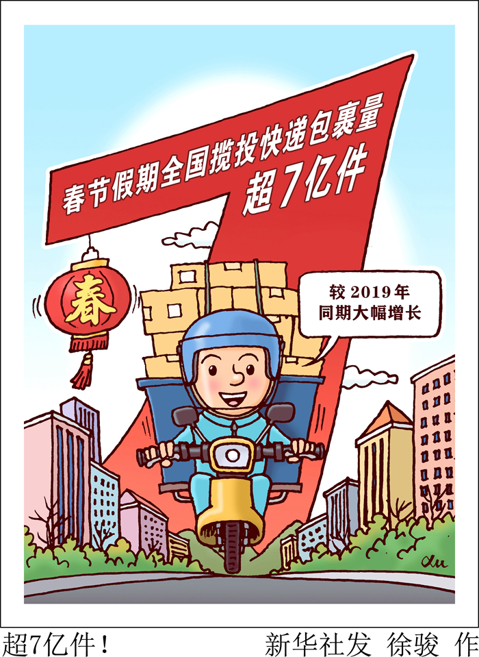 國(guó)家郵政局監(jiān)測(cè)數(shù)據(jù)顯示,1月21日至27日春節(jié)假期期間,全國(guó)郵政快遞業(yè)攬收快遞包裹約4.1億件,與去年春節(jié)假期相比增長(zhǎng)5.1%,較2019年春節(jié)假期增長(zhǎng)192.9%;投遞快遞包裹3.3億件,與去年春節(jié)假期相比增長(zhǎng)10.0%,較2019年春節(jié)假期增長(zhǎng)254.8%。