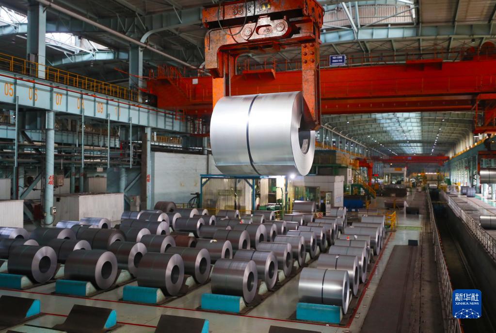 在本鋼冷軋廠,吊車在吊裝鋼卷(2021年8月18日攝)。新華社記者 楊青 攝