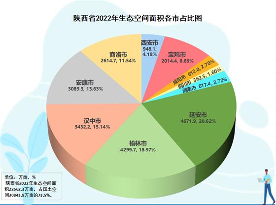 陜西南部秦巴山脈、北部黃土高原、中部渭河川地,自然生態(tài)空間多、占比大。陜西省生態(tài)空間數(shù)據(jù)中心提供的數(shù)據(jù)顯示,全省國(guó)土空間3.08億畝,其中生態(tài)空間(林地、草地、濕地、荒野)2.26億畝。從全省10市生態(tài)空間大格局分析觀察,黃土高原腹地的延安是全省生態(tài)空間第一市,生態(tài)空間4671.9萬(wàn)畝、占本市國(guó)土空間84.1%、占全省生態(tài)空間20.6%。長(zhǎng)城內(nèi)外、林草過(guò)度的榆林居第二,生態(tài)空間4299.7萬(wàn)畝、占本市國(guó)土空間66.8%、占全省生態(tài)空間19.0%。第三是漢中,生態(tài)空間3432.2萬(wàn)畝、占本市國(guó)土空間84.4%、占全省生態(tài)空間15.1%。第四是安康,生態(tài)空間3089.3萬(wàn)畝、占本市國(guó)土空間87.5%、占全省生態(tài)空間13.6%。其后,依次分別是商洛,生態(tài)空間2614.7萬(wàn)畝、占本市國(guó)土空間90.0%、占全省生態(tài)空間11.5%,寶雞2014.4萬(wàn)畝、占本市74.1%、占全省8.9%,西安948.1萬(wàn)畝、占本市62.6%、占全省4.2%,渭南617.4萬(wàn)畝、占本市31.5%、占全省2.7%,咸陽(yáng)612萬(wàn)畝、占本市39.5%、占全省2.7%,銅川362.5萬(wàn)畝、占本市62.2%、占全省1.6%。