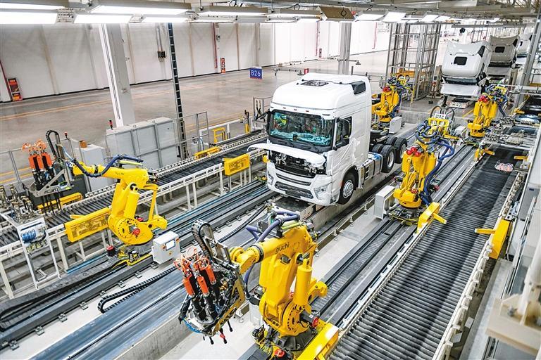 陜汽重卡擴(kuò)能項目總裝生產(chǎn)線,工業(yè)機(jī)器人正在進(jìn)行自動化裝配作業(yè)。(資料照片) 記者 竇翊明 攝