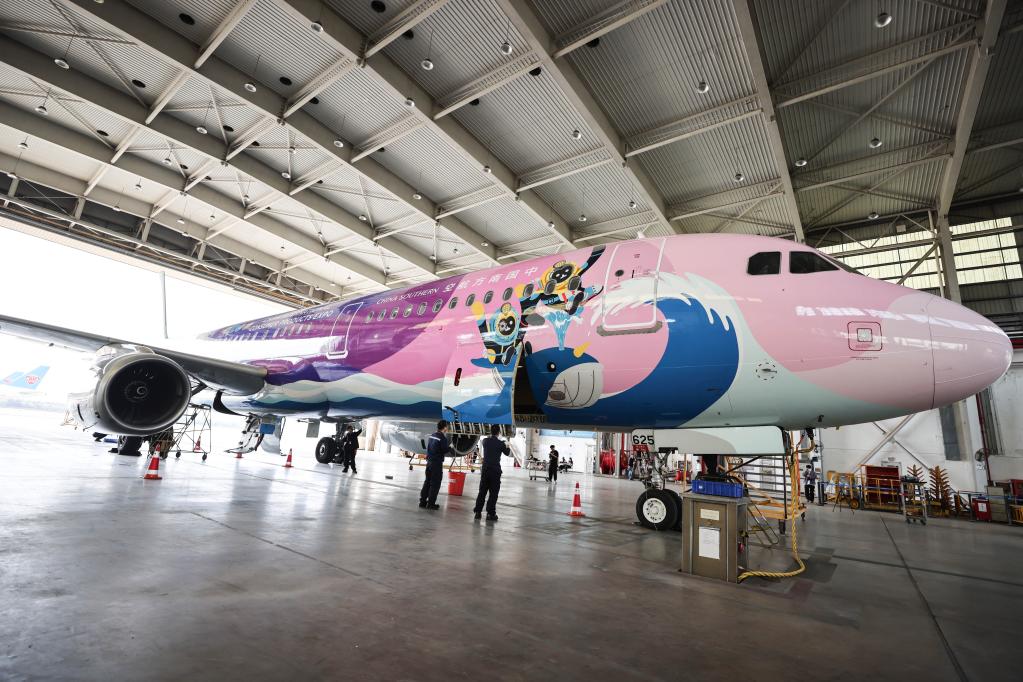 2023年3月7日,在海口美蘭國際機場,南航機務人員對“消博號”彩繪飛機進行深度檢查。新華社記者 張麗蕓 攝