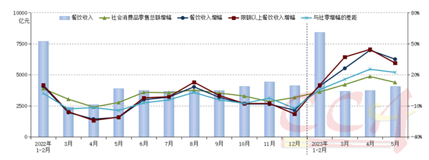 中國烹飪協(xié)會結(jié)合往年數(shù)據(jù)分析指出,2023年5月份全國餐飲收入、限上餐飲收入增速較去年同期上升56.2個、52.2個百分點。1-5月,全國餐飲收入、限上餐飲收入增速較去年同期上升31.1個、34.5個百分點,餐飲收入占社會消費品零售總額的10.6%。