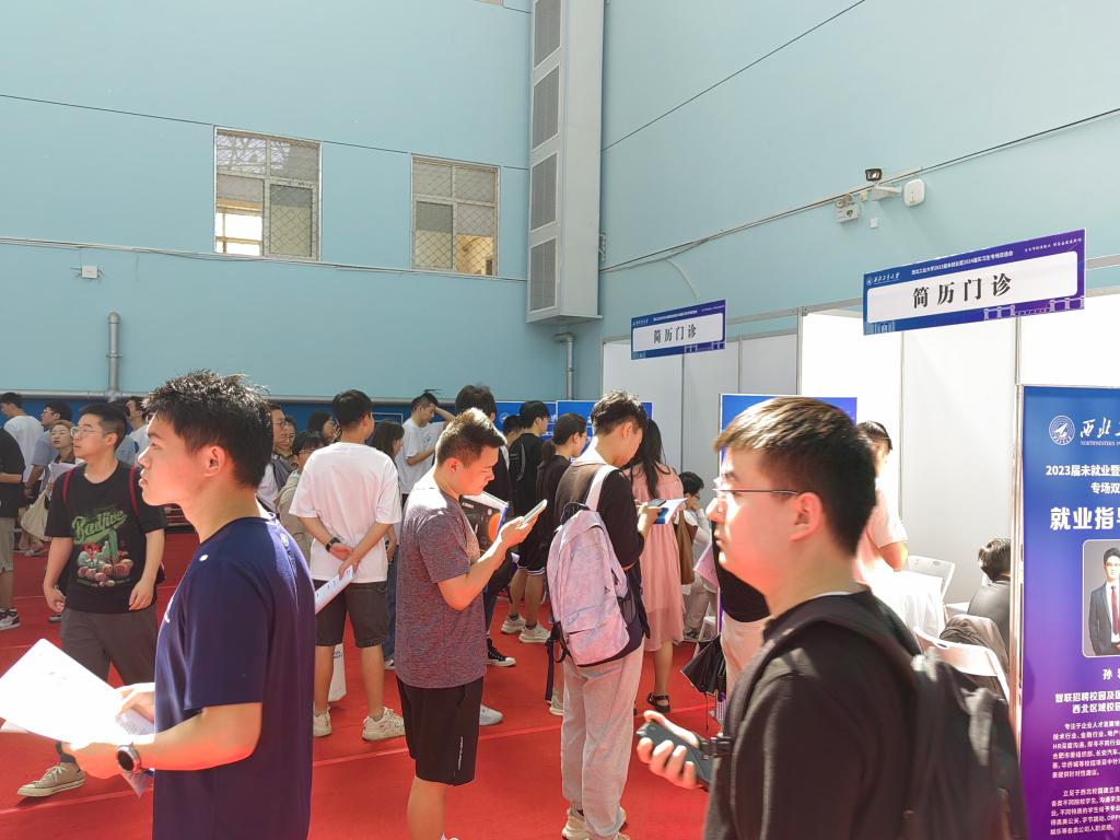 西北工業(yè)大學(xué)舉辦的招聘會(huì)上,學(xué)生在簡(jiǎn)歷門(mén)診咨詢(xún)。
