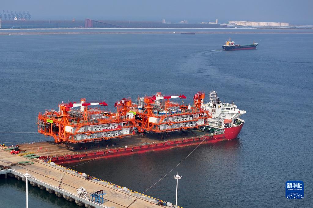這是8月9日在天津濱海新區(qū)拍攝的渤中19-6凝析氣田I期開發(fā)項目組塊裝船作業(yè)現(xiàn)場。組塊裝船后將赴渤海西部海域,進入海上安裝和聯(lián)調階段。新華社發(fā)(杜鵬輝攝)