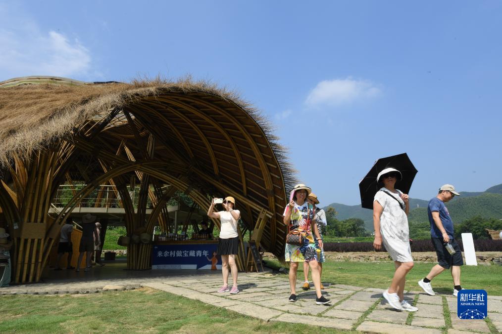 8月11日,游客在安吉余村參觀用當(dāng)?shù)厥a(chǎn)的竹材料建造的建筑。
