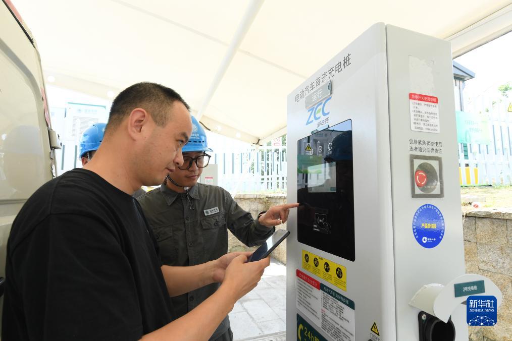 8月11日,游客在安吉余村一處停車場為電動(dòng)車充電。
