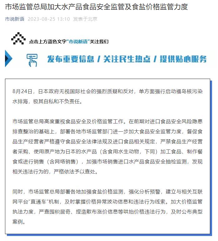 市場監(jiān)管總局高度重視食品安全及價(jià)格監(jiān)管工作。在前期對(duì)進(jìn)口食品安全風(fēng)險(xiǎn)隱患排查整治的基礎(chǔ)上,部署各地市場監(jiān)管部門進(jìn)一步加大食品安全監(jiān)管力度,督促食品生產(chǎn)經(jīng)營者嚴(yán)格遵守食品安全法律法規(guī)及進(jìn)口食品相關(guān)規(guī)定,嚴(yán)禁食品生產(chǎn)經(jīng)營者采購、使用原產(chǎn)地為日本的水產(chǎn)品(含食用水生動(dòng)物,下同)加工食品、制作餐食或進(jìn)行銷售(含網(wǎng)絡(luò)銷售),加強(qiáng)市場銷售進(jìn)口水產(chǎn)品食品安全抽檢監(jiān)測,發(fā)現(xiàn)相關(guān)違法行為的,嚴(yán)格依法予以查處。