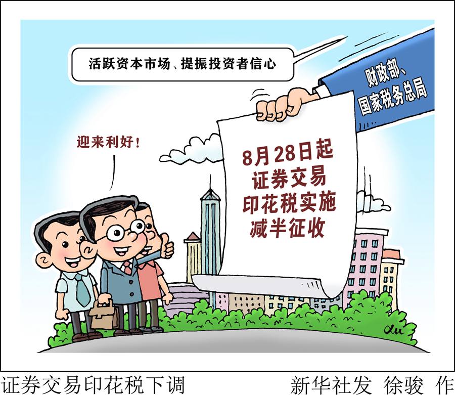 新華社北京8月27日電 記者27日從財(cái)政部了解到,財(cái)政部、國家稅務(wù)總局當(dāng)日發(fā)布公告稱,為活躍資本市場(chǎng)、提振投資者信心,自2023年8月28日起,證券交易印花稅實(shí)施減半征收。