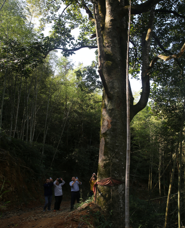 若非親眼所見,簡直難以置信,眼前是一棵三個成年男子都難以環(huán)抱的含笑,一棵常被用來點綴的綠化樹,竟長成二三十米高的參天大樹,它長出了人們的經驗范疇,讓人一下失去贊美的語言。這么高大的含笑不要說是全縣,就是全市、全省甚至全國也為之罕見。巧的是,這棵參天大含笑,又恰好長在必經之地的古道山蔭處,自然為世人所銘記。