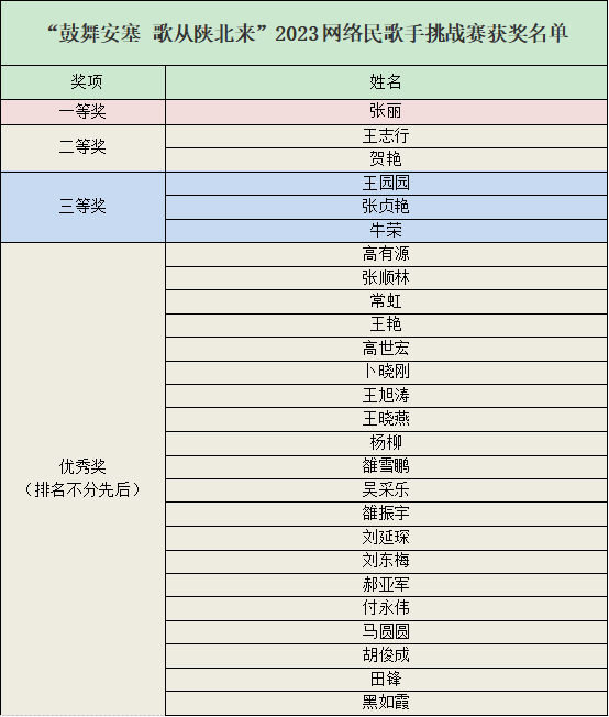 決賽現(xiàn)場,參賽選手們依次上場深情獻唱,《一對對鴛鴦水上漂》《小桃紅》《走西口》等經(jīng)典的陜北民歌喚起在場群眾陣陣掌聲。最終,經(jīng)過一番精彩獻唱,專家評審團現(xiàn)場打分決出“鼓舞安塞 歌從陜北來”2023網(wǎng)絡民歌手挑戰(zhàn)賽一、二、三等獎獲獎選手及優(yōu)秀選手。其中,張麗獲得一等獎,王志行、賀艷獲得二等獎,王園園、張貞艷、牛榮獲得三等獎,因4名民歌歌手棄權比賽,剩余20名民歌歌手均獲優(yōu)秀獎。