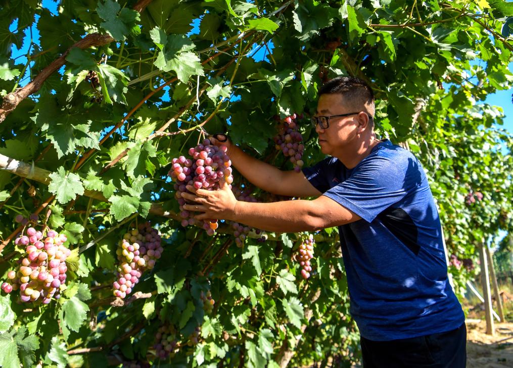 在托克托縣郝家窯村的一處葡萄園,村民在采收葡萄。新華社記者 李志鵬 攝