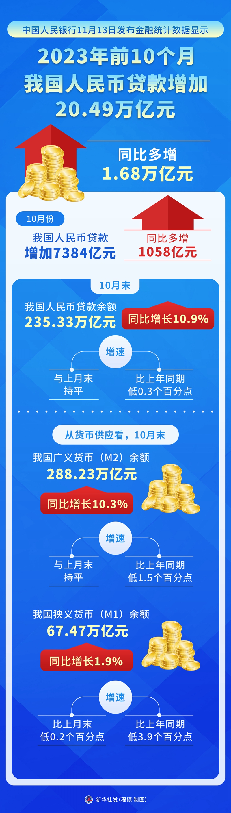 中國人民銀行13日發(fā)布金融統(tǒng)計(jì)數(shù)據(jù)顯示,前10個月我國人民幣貸款增加20.49萬億元,同比多增1.68萬億元。10月份,我國人民幣貸款增加7384億元,同比多增1058億元。
