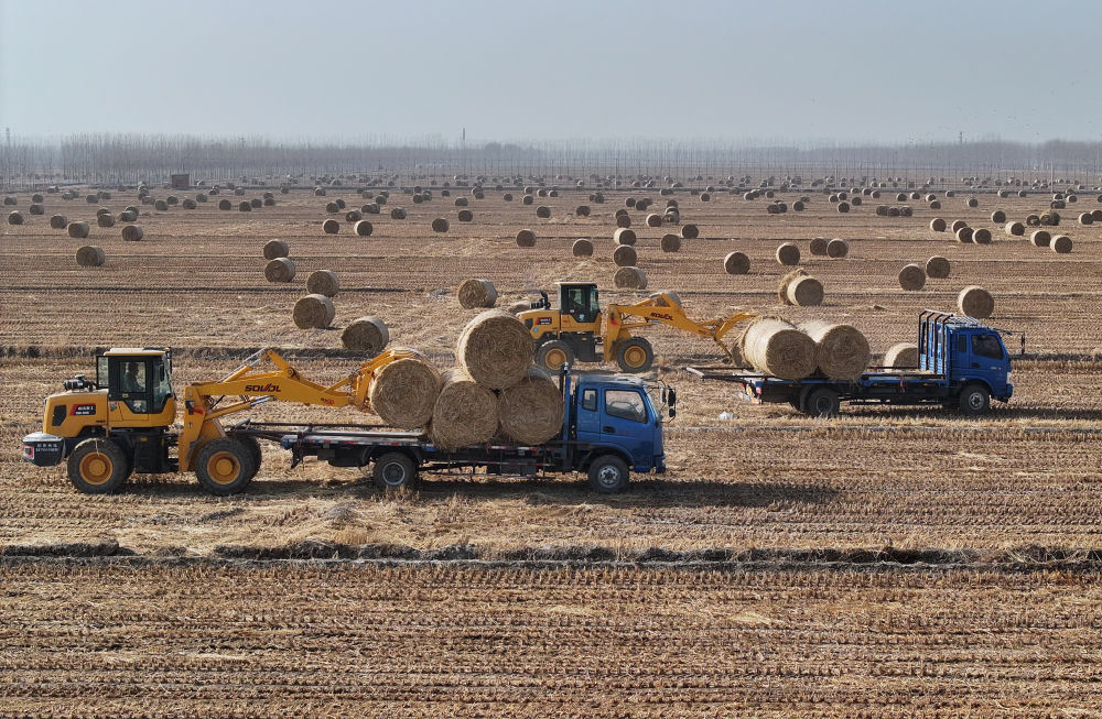 ↑河北省唐山市曹妃甸區(qū)第八農(nóng)場田間,稻草回收企業(yè)的工人將打好捆的稻草裝車(無人機(jī)照片,12月10日攝)。曹妃甸區(qū)通過將稻草集中收集用于生物質(zhì)發(fā)電、牲畜飼料和有機(jī)肥生產(chǎn),有效提高了秸稈綜合利用率。