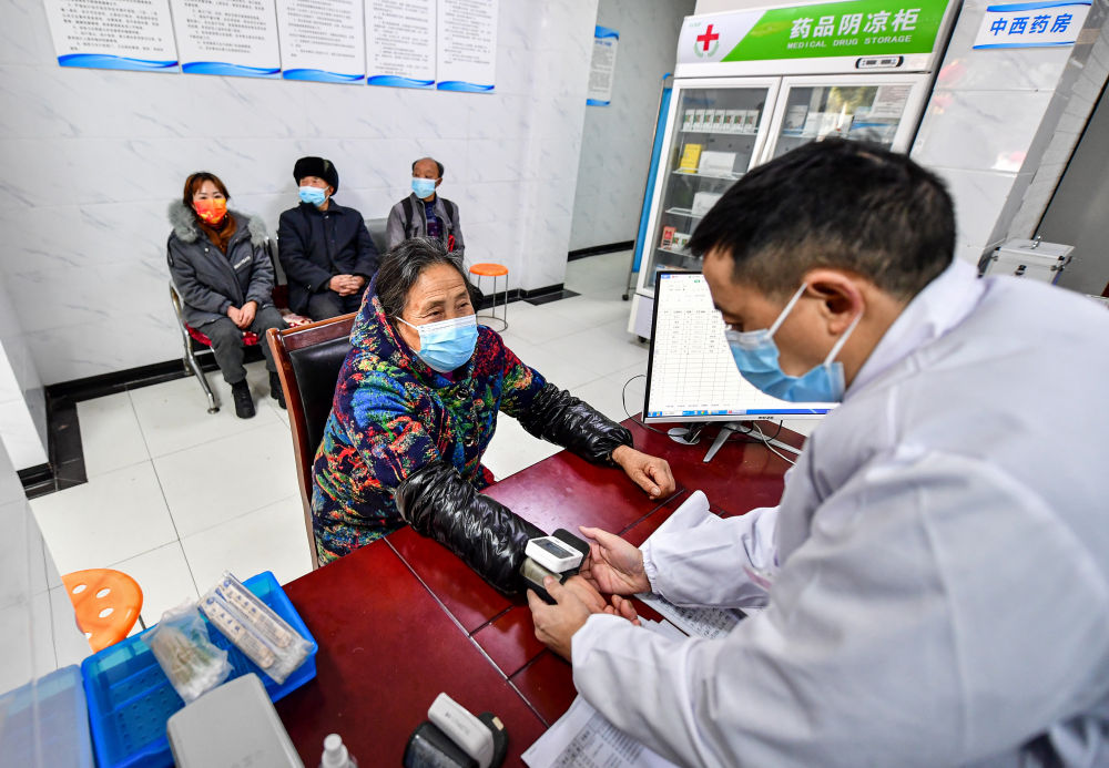 ↑四川省綿陽市北川縣曲山鎮(zhèn)任家坪村、石椅村聯(lián)合衛(wèi)生室村醫(yī)趙太安(右一)在村衛(wèi)生室為前來問診的村民測量血壓(1月19日攝)。