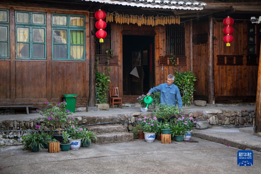 這是湖南省會同縣堡子鎮(zhèn)黃旗村3組村民唐快生給庭院內(nèi)的綠植澆水(2022年10月5日攝)。新華社發(fā)(張鐳攝)