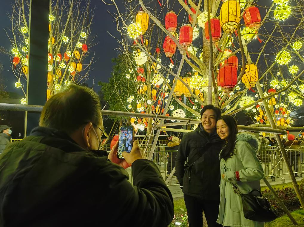 2023年12月30日,人們在上海豫園商城觀燈拍照。新華社記者 劉穎 攝