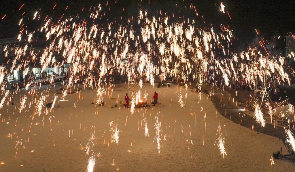1月13日,民間藝人在河北省承德市興隆縣一景區(qū)為游客表演“打樹(shù)花”(無(wú)人機(jī)照片)。新華社發(fā)(劉滿(mǎn)倉(cāng) 攝)