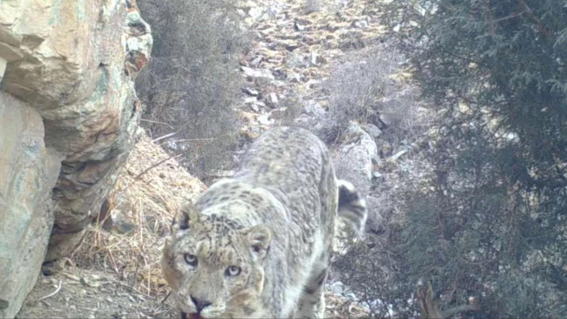 照片中的“大萌貓”一張是漫步在草叢中的荒漠貓,另一張是行走在樹叢中的雪豹。二者都是國家一級保護野生動物。