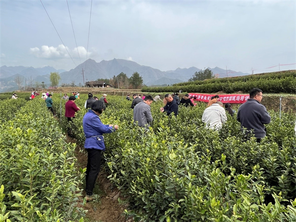 山間云霧繞,茶園綠意濃。在采摘場(chǎng)內(nèi),千畝茶園新芽吐露,一排排整齊的茶樹如同“綠毯”鋪滿了漫山遍野,縣茶技站專家對(duì)采摘技術(shù)進(jìn)行了現(xiàn)場(chǎng)培訓(xùn),采茶工人熟練地采摘著新茶,豐收的喜悅洋溢在她們的臉上,時(shí)時(shí)回蕩著不一樣的“茶語(yǔ)花香”。