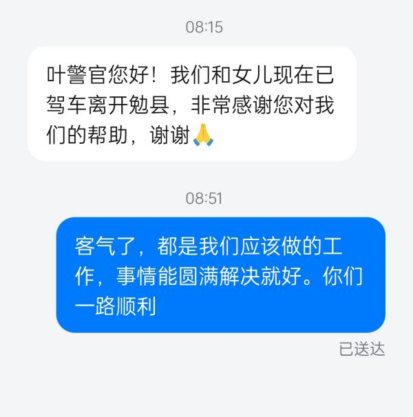 經(jīng)詢問,兩人是貴州貴陽人,其女兒饒某因家庭矛盾離家出走勉縣尋找網(wǎng)友嚴(yán)某,至今已失聯(lián)半個月。夫妻倆心急如焚,駕車從貴陽趕到勉縣,由于人生地不熟,便想到派出所尋求幫助。了解情況后,接警民警及時將指令下達給社區(qū)民警。社區(qū)民警會同警務(wù)助理及社區(qū)工作人員開展尋人工作,經(jīng)過不懈努力,終于在嚴(yán)某租住的民房內(nèi)找到饒某,并將其帶回派出所。